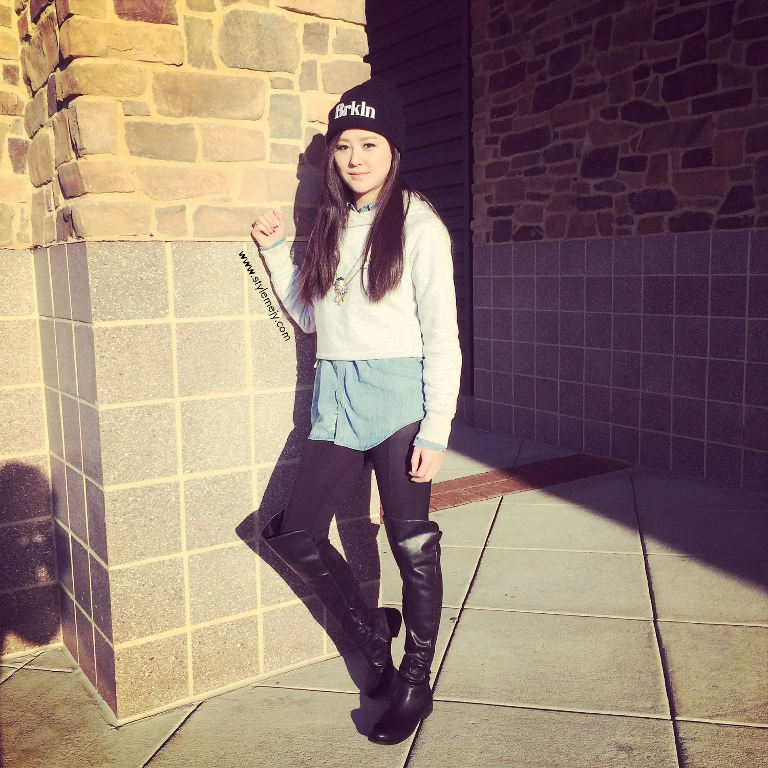 Today's outfit features an Aritzia haul from their Rockefeller location when I stopped by in the summer. My favorite way to layer is with different textures, like a heather grey cropped hoodie with a collared denim shirt. Knee high boots add an additional dimension to the proportions.